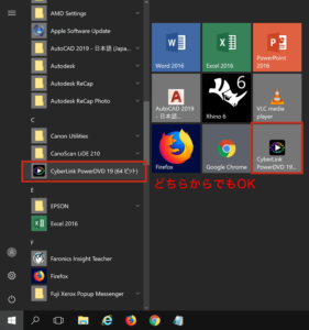 Blu-ray対応のドライブは1301スタッフルームで貸し出しています。(機材の貸し出しには学生証が必要です) - スタートメニューから「CyberLink PowerDVD」のアイコンをクリックして起動します。