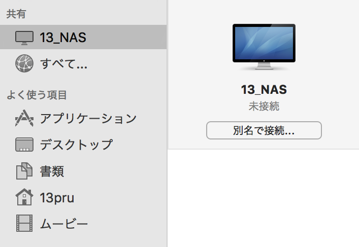*左サイドバーに表示された「共有」の「13_NAS」→「別名で接続」をクリックしてください。