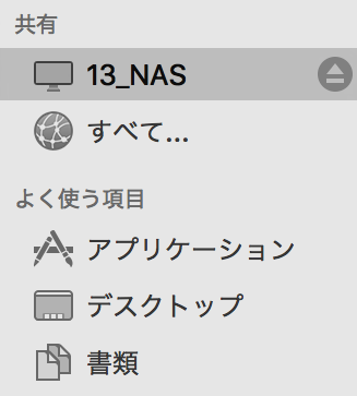 Finderのサイドバーに表示されている「13_NAS」の右側「▲」マークをクリックします。デスクトップのアイコンが無くなったことも確認してください。(デスクトップのアイコンをゴミ箱にすてる操作でも、切断できます。)