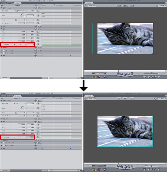 モーションタブを開き、[歪み]→[アスペクト比]の数値を、正しい比率で表示されるように調整してください。