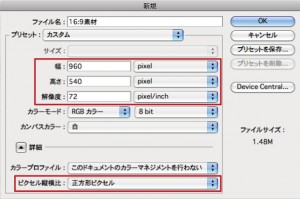 • ワイド画面(16:9)DVD用の動画の場合 →「幅:960pixel」「高さ:540pixel」(ピクセル縦横比:正方形ピクセル)