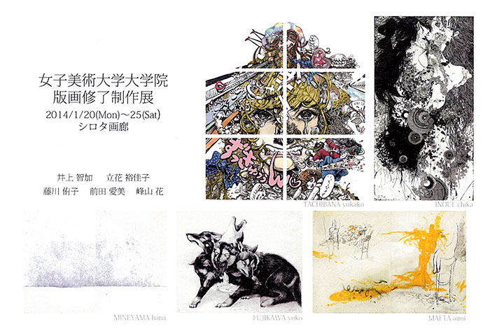 女子美術大学大学院版画終了制作展 2013-12-24 (火) 18:22 展覧会・イベント情報 共同PCルーム大学院生アドバイザーとして活躍している藤川さんを含む版画科院生の展示です。 女子美術大学大学院 版画修了制作展 井上智加・立花裕佳子・藤川侑子・前田愛美・峰山花 2014年1月20日(月)-25日(土) 日曜休廊 AM11:00 – PM7:00 (最終日PM5:00) オープニングパーティー 20日pm5:00から シロタ画廊 東京都中央区銀座7-10-8 Tel: 03 3572 7971 Fax:03 3572 7972 関連記事1301スタッフ[WS]Premiere Pro CS6で作るスライドショー[Back Mutation:Keiichiro Furukado]教職員|教職員専用貸出機材一覧