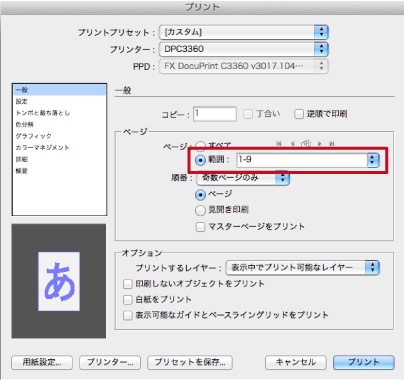 *[1-9]のようにハイフンで数字をつないで入力すると1ページ目から9ページ目までが印刷され、[1,9]のようにコンマで区切って入力すると1ページ目と9ページ目が印刷されます。