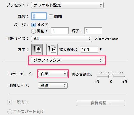 モノクロで出力したい場合には「プリンタ…」設定「グラフィックス」の「カラーモード」を「白黒」に設定して下さい。