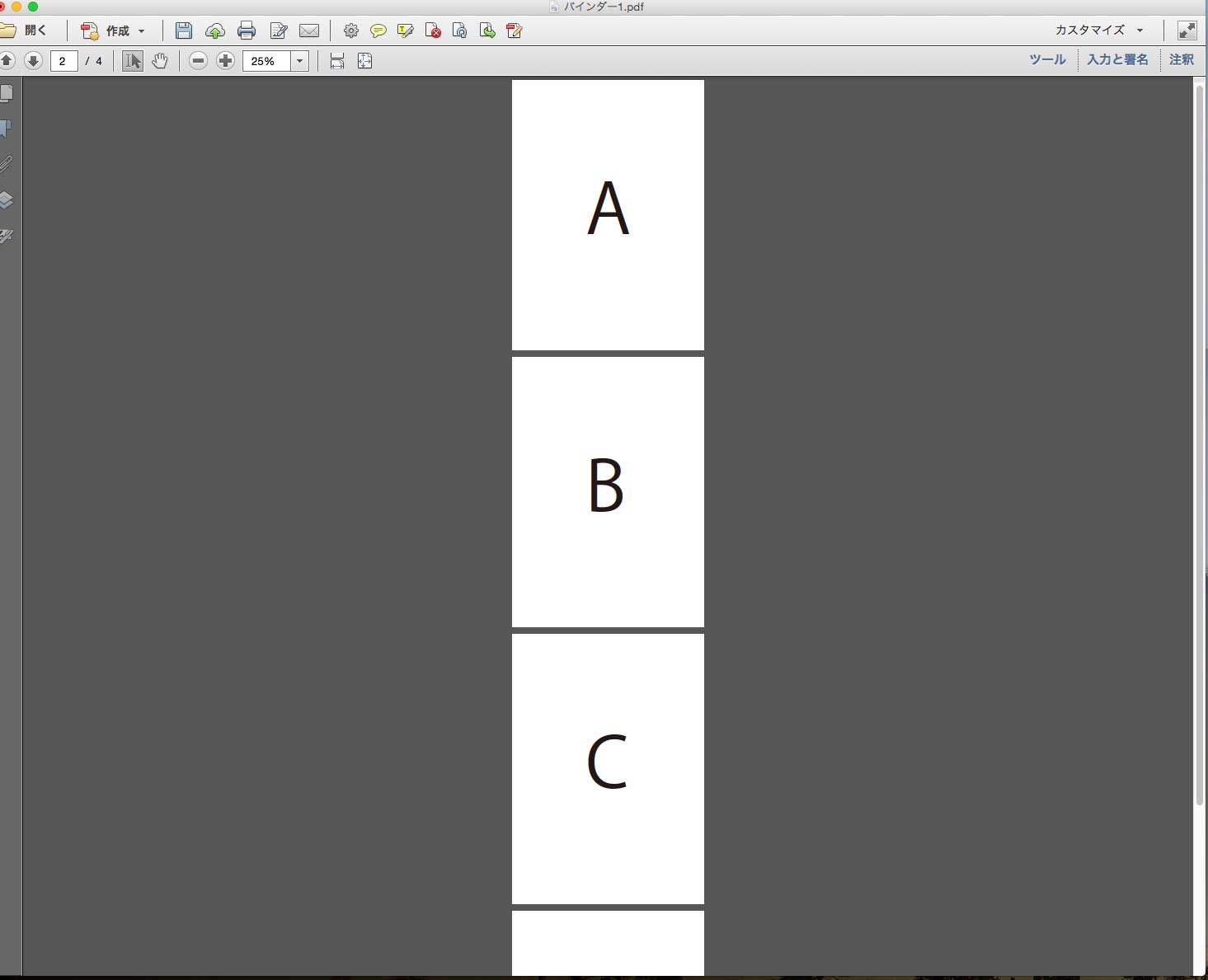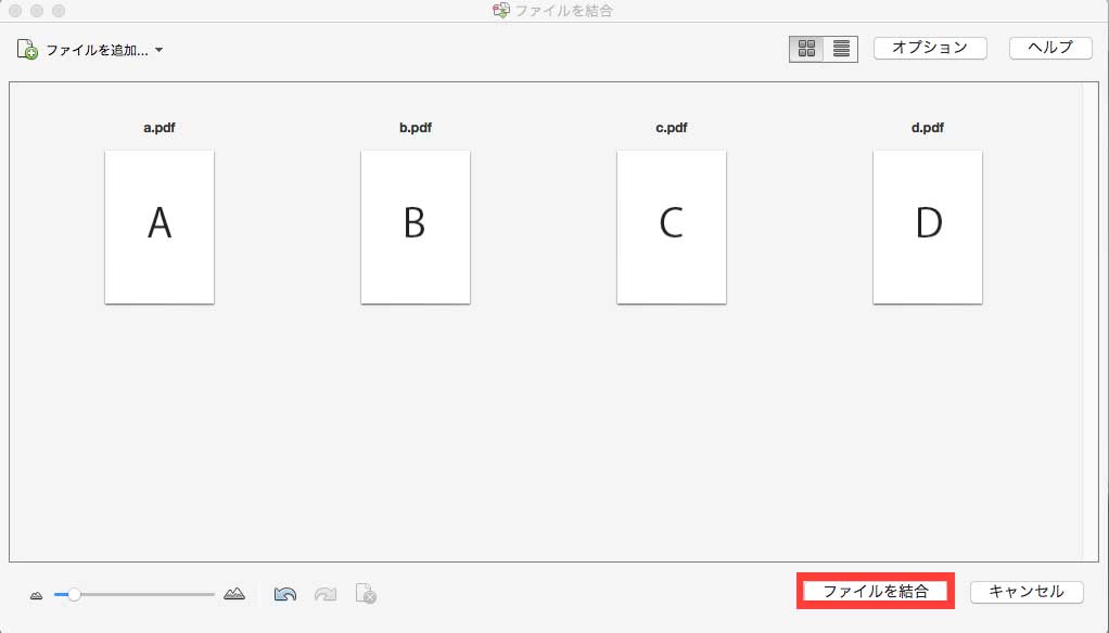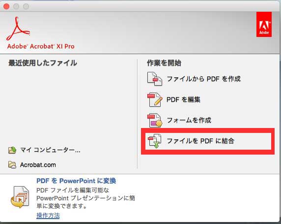 【Acrobat Pro】複数のPDFファイルをひとつに統合するには 2015-11-28 (土) 13:44 ACROBAT | FAQ よくある質問 ひとつひとつ、バラバラなPDFのデータをひとつに統合する方法です。 1.アプリケーションから、「Adobe Acrobat Pro」を選択します。 2.「ファイルをPDFに統合」を選択します。 3.次に表示されるエリア内に、統合したいPDFファイルをドラッグします。 4.結合したいPDFファイルを確認し、「ファイルを統合」をクリックします。 5.PDFファイルが一つに統合されました、ここで順番を変更する等の編集も可能です。編集後、保存をしてください。 関連記事課金制レーザープリンターを使用する時の注意点【教職員向け】一部の教室に作業用ディスプレイを追加しましたAdobe CC の購入について1315C・1315D教室のPC・備品が新しくなりました